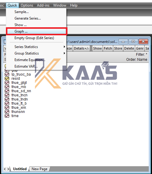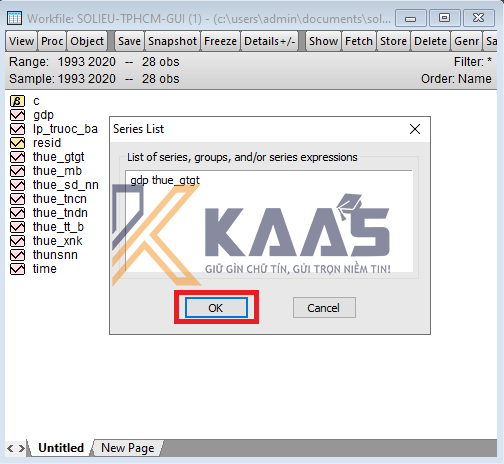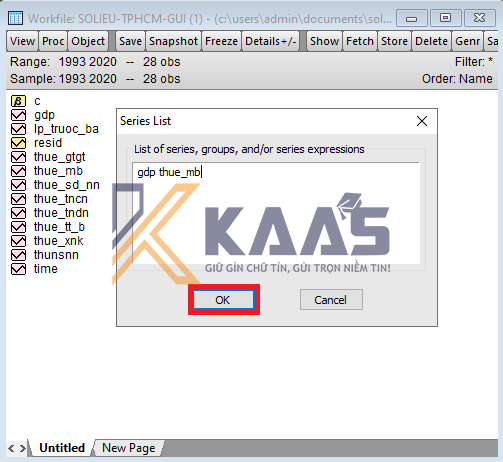 Một cửa sổ Series List xuất hiện. Ta gõ tên biến độc lập (gdp) và biến phụ thuộc (thue_gtgt) giữa hai biến này là khoảng trắng. Khi đó màn hình sẽ như sau (không cần viết hoa)