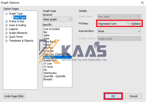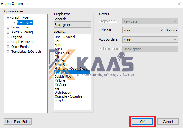 Bước 2: Sau khi nhấn OK, cửa sổ Graph Options hiện lên. Chọn tính năng Graph Type trong phần Option Pages, và chọn kiểu đồ thị muốn vẽ trong phần Specific là Scatter.