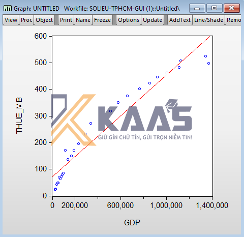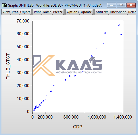 Mục đích của việc vẽ đồ thị này cho phép ta đánh giá sơ bộ về mối quan hệ cũng như hình dung được dạng hàm (mô hình) giữa hai biến với nhau. Để vẽ đồ thị phân tán của hai biến, chẳng hạn như trong ví dụ 1 ta vẽ đồ thị phân tán của gdp và thue_gtgt.