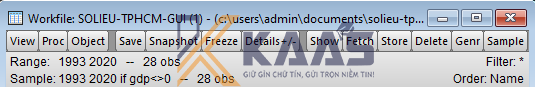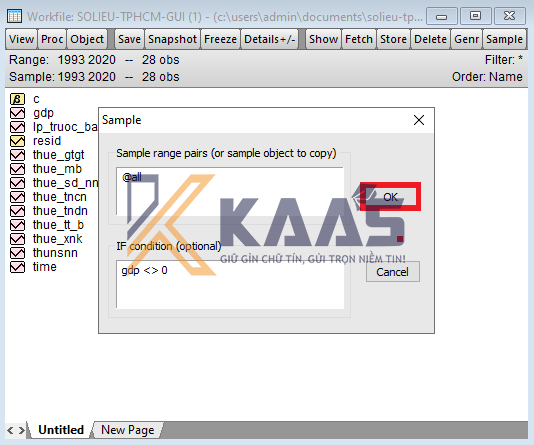Bước 2: Định lại mẫu với biến gdp để loại các giá trị bằng 0 bằng cách: trên cửa sổ Workfile nhập chọn nút Sample. Sau khi cửa sổ Sample hiện lên, ta nhập vào ô IF condition: giavang <>0 rồi nhấn OK