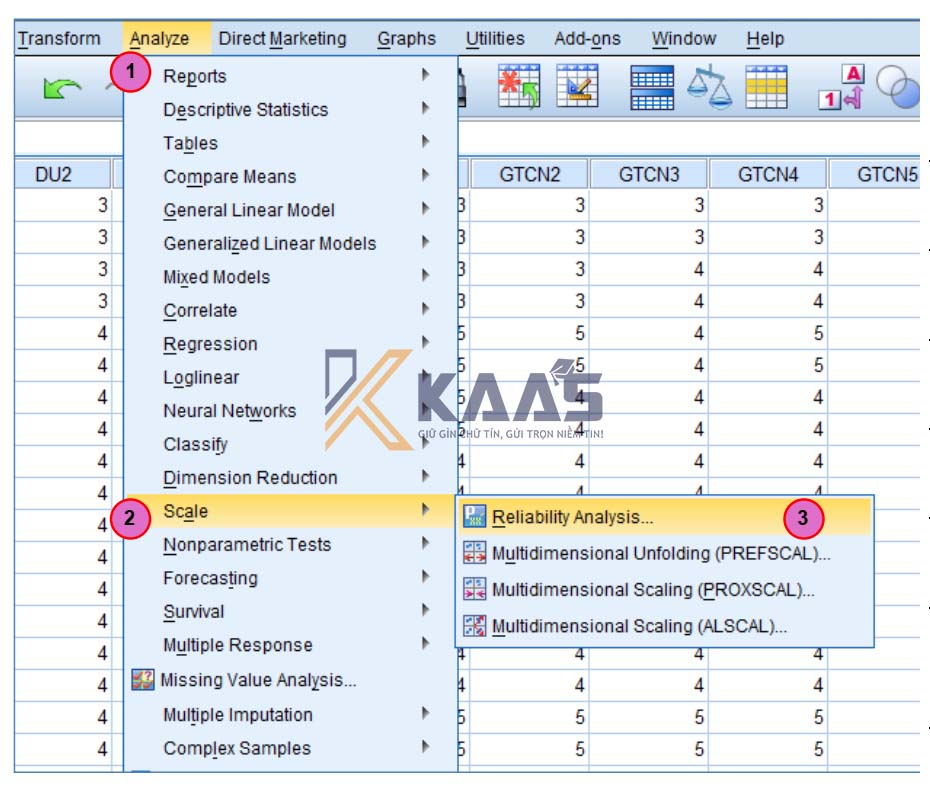 Bước 1: Vào menu Analyze -> Scale -> Reliability Analysis