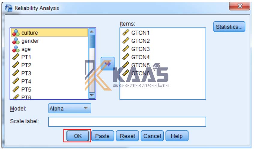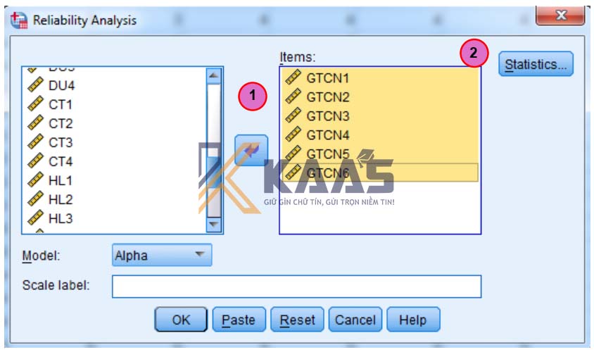 Bước 2: Đưa các biến quan sát cần kiểm định độ tin cậy vào mục Items bên phải, sau đó chọn Statistics