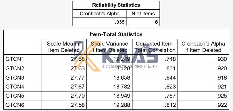 Kết quả kiểm định cho thấy các biến quan sát đều có hệ số tương quan biến tổng phù hợp (Corrected Item – Total Correlation > 0.3). Hệ số Cronbach’s Alpha = 0.935 (lớn hơn 0.8) nên thang đo lường rất tốt (Nguồn: Hoàng Trọng, Chu Nguyễn Mộng Ngọc, Phân tích dữ nghiên cứu với SPSS).